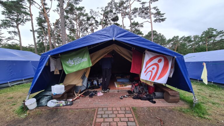 Ubytování: ve velkých modrých stanech s dřevěnou podsadou s matracemi pro 8 osob, vlastní spacák s sebou. Sociální zázemí s umývárnou, sprchami s teplou vodou a WC kluci/holky.